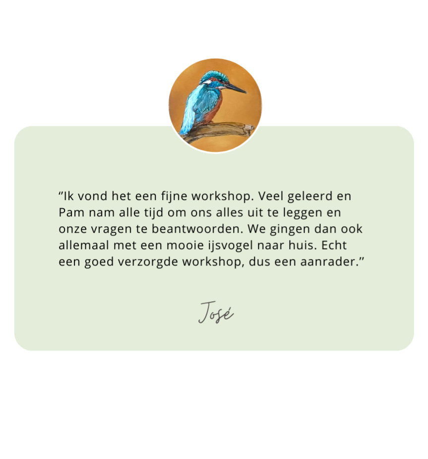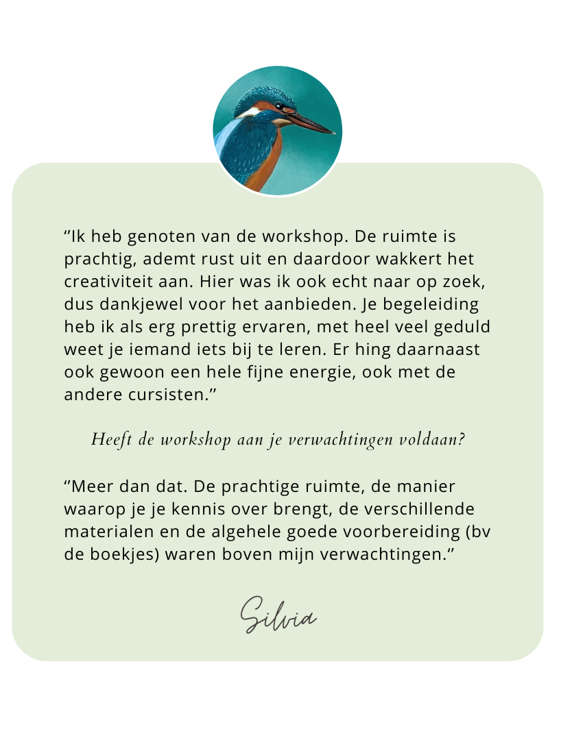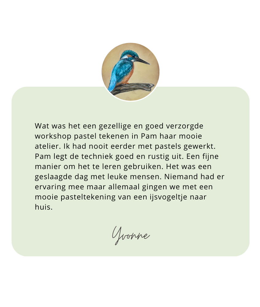 Ontdek de kunst van het werken met pastel tijdens een van mijn workshops of cursussen. Je maakt op een toegankelijke en ontspannen manier kennis met de technieken van het pasteltekenen. Ik begeleid je stap voor stap en geef individuele tips, zodat je met nieuwe vaardigheden én een mooi resultaat naar huis gaat.